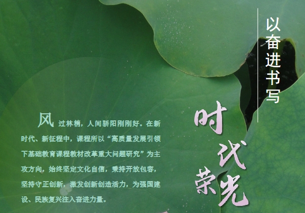 时间是筑梦者披荆斩棘的注脚,是奋斗者栉风沐雨的见证。在新时代、新征程中,课程所以“高质量发展引领下基础教育课程教材改革重大问题研究”为主攻方向,秉持“为课程,为学生,为未来”的专业信念,创新引领课程与教学理论实践研究,厚植发展底色,斗志昂扬续写新篇章。