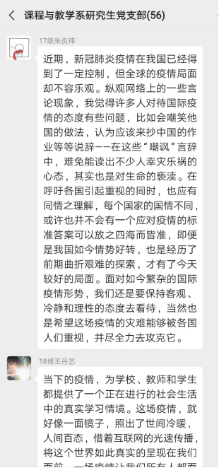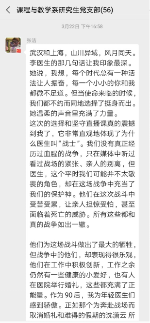 2020年3月22日,课程与教学系研究生党支部开展了主题为重温“雷锋精神”,决胜疫情关键期的组织生活会,此外组织观看了“上海交通大学医学院2020学年春季学期青年战“疫”云课堂之连线武汉视频公开课。此次会议由党支部书记董光楠同志主持,全体学生党员共同参与。会议围绕党员身份与雷锋精神、对疫情中社会现象的反思与体会、公开课观后感等三个主题展开,党员同志积极进行讨论交流并将感悟发送至微信群。