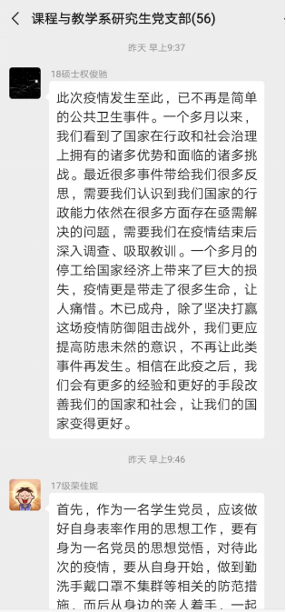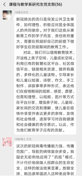 2020年2月23日,课程与教学系研究生党支部开展了主题为“党旗飘扬、责任在肩”的线上组织生活会。此次会议由党支部书记董光楠同志主持,全体学生党员共同参与。会议分为两个环节进行,第一环节为认真阅读、深入学习习近平总书记关于疫情防控的一系列重要指示,包括习近平总书记对新型冠状病毒感染的肺炎疫情做出的重要指示及中共中央政治局常务委员召开会议研究新型冠状病毒感染的肺炎疫情防控工作等资料。第二阶段为党员同志结合身份特点和专业特点等实际情况积极思考如何在“疫情保卫战”中发挥自己的作用,进行线上交流与讨论并将感悟发送至微信群。