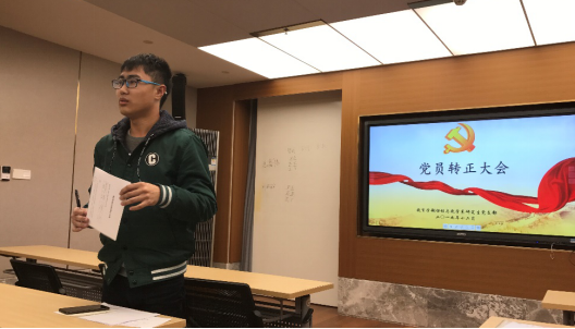 而后,组织委员刘童同志向支部介绍毛嘉伟同志在预备期间的教育和考察情况, “毛嘉伟同志自递交入党申请以来,各方面的表现均向党员标准看齐,在预备期间,他积极主动,认真完成每一项学习任务。平日里,主动关心国家大事,并能做出正确的评论和反应。对待学习,勤奋踏实,图书馆是他的常驻地,导师项目中有他活跃的身影。他主动承担班长一职,工作细致耐心,抱着为同学服务的宗旨。助人为乐,是周围人对他一致的评价。综上,我支部认为毛嘉伟同志各方面表现符合党员要求,同意该同志如期转正,提交学部审批。”