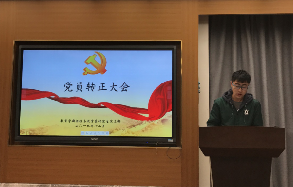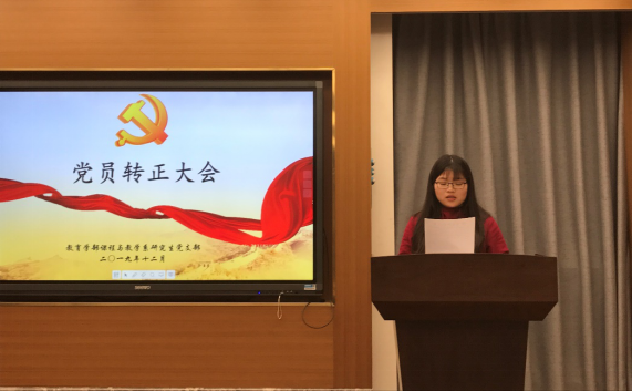 2019年12月24日,课程与教学系研究生党支部召开了党员转正大会。此次会议由党支部书记董光楠同志主持,到会正式党员27人,课程与教学系教工党支部副书记雷浩老师应邀到场指导。会议是关于毛嘉伟同志和刘亚玲同志的预备党员转正大会。