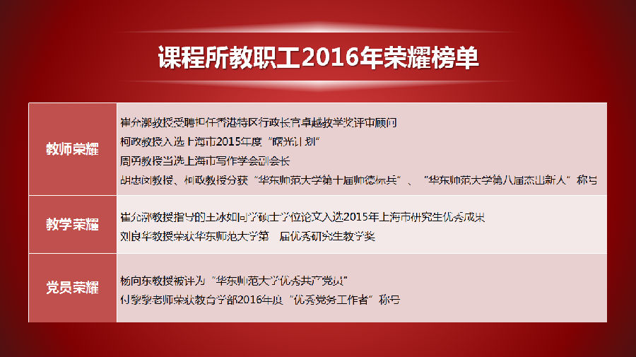 会议还隆重宣读了华东师范大学2016年度年终考核的“学校优秀”和“学部优秀”教师名单,课程所周文叶副教授被评为学校“优秀”教师、周勇教授被评为教育学部“优秀”教师,均榜上有名。
