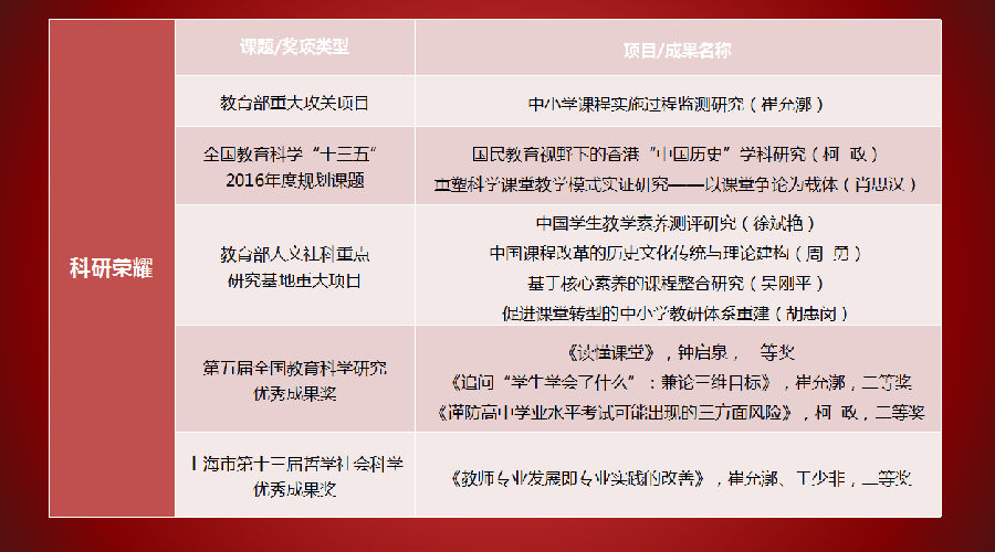 会上,课程所崔允漷教授和柯政教授荣获2016年教育学部“优秀科研奖”。优秀科研奖为教育学部奖励科研产出最高的教师而设立,崔允漷教授和柯政教授凭借2016年度教育部重大攻关项目、第五届全国教育科学研究优秀成果奖等高级别课题、高质量科研成果及重要科研获奖等突出成绩,在学部300多位教师中脱颖而出。此外,刘良华教授凭借对研究生教学工作的鼎力支持、徐斌艳教授凭借对上海2020年承办第14届国际数学教育大会等国际交流事务的积极推进,分获学生工作贡献奖和国际交流促进奖。