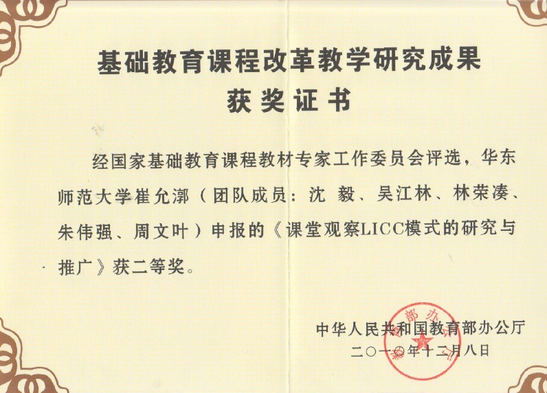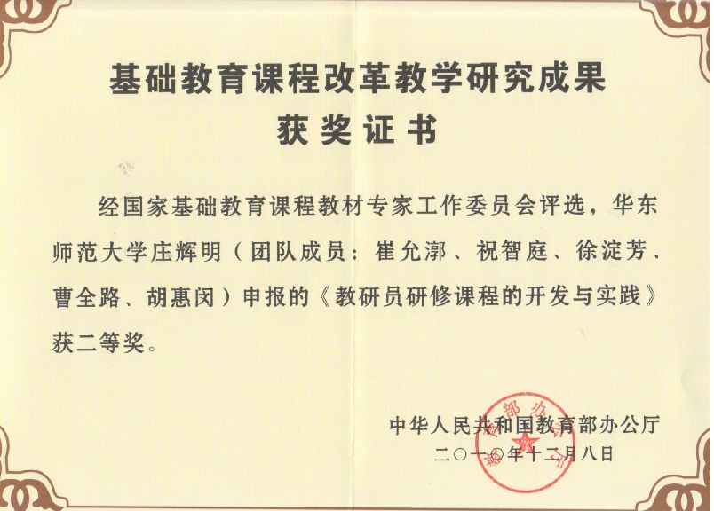 为落实《国家中长期教育改革与发展规划纲要》,总结前10年我国基础教育课程改革教学研究的成果,深入推进素质教育和课程改革,教育部决定在全国范围内评选“国家基础教育课程改革教学研究成果奖”。国家基础教育课程教材专家工作委员会经过近半年的努力,通过申报、评审、公示等程序之后,最后确定43项成果为一等奖,92项成果为二等奖,208项成果为三等奖。我所吴刚平教授领衔的“校本课程开发与实施”荣获“一等奖”,庄辉明教授领衔的“教研员研修课程的开发与实践”和崔允漷教授领衔的“课堂观察LICC模式研究与推广”分别荣获“二等奖”。
