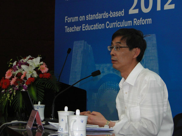 19日上午8:50,此次论坛正式开始,首先由课程与教学研究所所长崔允漷教授向与会专家做题为“《教师教育课程标准》的解读”的主题报告,并重点探讨了基于标准的教师教育新教材应如何编写的问题。随后华东师大副校长陆靖教授和西南大学研究生院副院长张学敏教授分别介绍了东、西部各具特色的免费师范生教师教育课程改革经验。