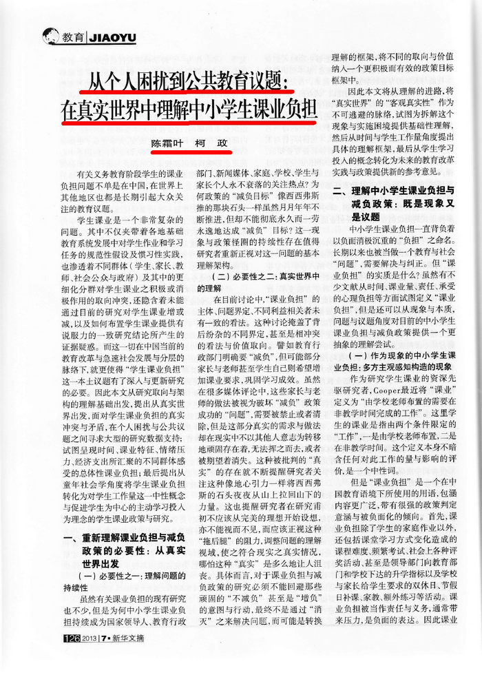 2013年4月,《新华文摘》第7期全文转载我所研究成果《从个人困扰到公共教育议题:在真实世界中理解中小学生课业负担》。本文系我所重大基地研究课题“义务教育阶段学生课业负担监测与公告制度研究”的阶段性成果,由课题组核心成员香港中文大学陈霜叶博士与我所柯政博士合作完成,首发于基地刊物《全球教育展望》2012年第12期。