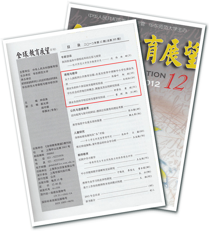 为此,课题组从多个层面展开研究,形成多项阶段性研究成果,其研究水平和成果质量得到学界的一致认可,被多家权威教育期刊收录发表。 《教育发展研究》(CSSCI)于2013年第6期以专题形式刊发三篇文章:《国内学界对课业负担概念的理解:基于500篇代表性文献的文本分析》(胡惠敏、王小平);《公众对课业负担的理解:基于2159份问卷调查结果》(柯政);《从哪里看出学生课业负担过重——对课业负担测量的思考与建议》(汤兆武、杨若斌)。在此之前,2012年第12期《全球教育展望》(CSSCI)已经刊发一组文章,对课业负担的基础概念和变量做了系统的研究综述,包括:《课业负担的个体层面变量研究综述》(文剑冰);《课业负担的学校层面变量研究综述》(董辉、杨兰);《课业负担的社会经济地位的概念、测量及其应用研究综述》(钟景迅、黄斌);《从个人困扰到公共教育议题:在真实世界中理解中小学生课业负担》(陈霜叶、柯政)。其中,香港中文大学陈霜叶博士与我所柯政博士合作的《个人困扰到公共教育议题:在真实世界中理解中小学课业负担》还被国内重要社科期刊《新华文摘》(2013年第7期)全文转引。