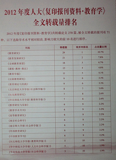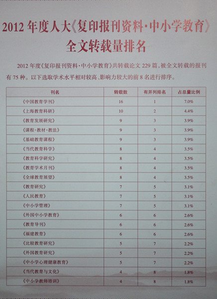 在本次“教育学学科期刊”全文转载排名中,《全球教育展望》转载量位列第六,转载率位列第九,综合指数位列第七。特别值得一提的是,《全球教育展望》在2012年度人大《复印报刊资料·教育学》全文转载量排名第三,在2012年度人大《复印报刊资料·中小学教育》全文转载量排名第四,相较以往的排名有了大幅度的上升。