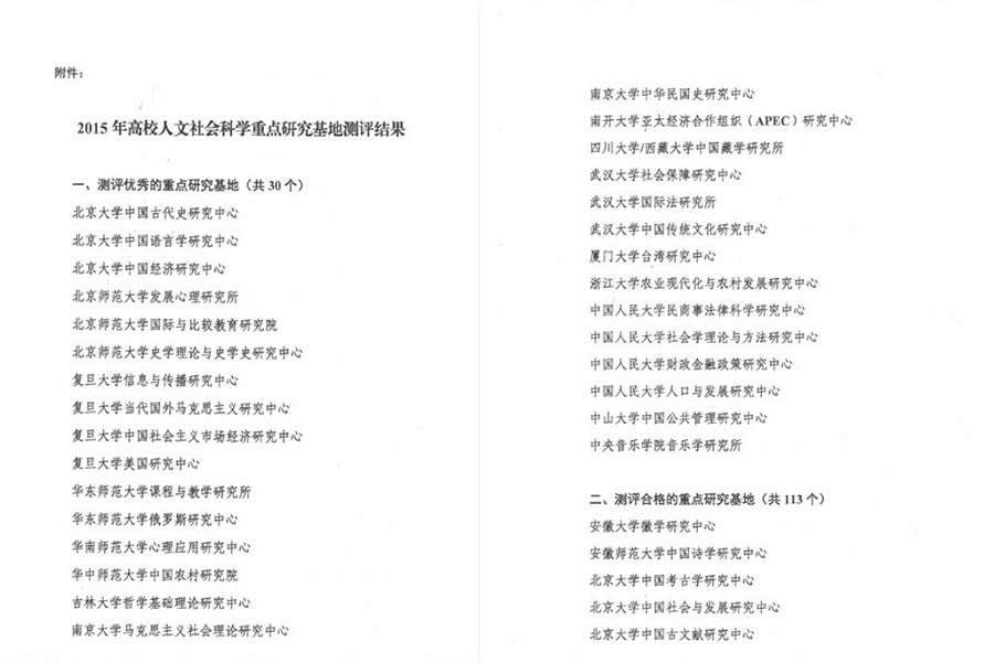 日前,教育部公布了2015年全国高校人文社会科学重点研究基地评估结果,我所在继2010年被测评为“优秀”基地后,此次再获 “优秀”佳绩!