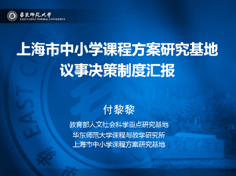 为增进上海市“立德树人”人文社科重点研究基地之间的交流,加强基地管理制度建设,上海市教委教研室召集各基地专职管理人员,于7月4日和5日召开了基地专职管理人员研讨会。市教委教研室徐淀芳主任、科研部王月芬主任、教研室张新宇老师出席,我校课程方案基地和数学基地、复旦大学化学基地、上海外国语大学英语基地、上海音乐学院音乐基地等十几个基地30余人参加。我所付黎黎老师代表课程方案基地赴会交流,并作报告。