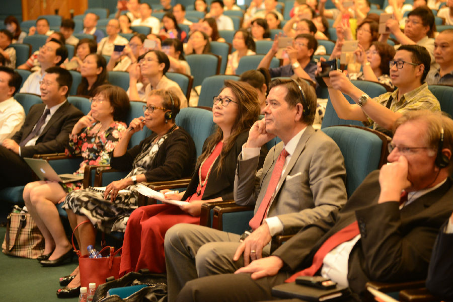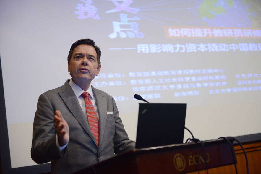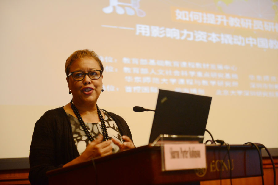 16日上午,论坛进行专题演讲。吴刚平教授主持,刘月霞副主任、Sharon P. Robinson总裁、LaCelle-Peterson副总裁、Fullen E. Clifton副总裁、Emily HU总裁、梁宇东主任、上海市教委教研室纪明泽副主任、北京海淀区教委罗滨副主任,以及崔允漷教授就中国教研的价值与使命、美国教师标准体系与中国教研体系的比较与评价、中国教研创新方向、多元资本对中国教研体系升级的助推作用等话题,进行了专题演讲。