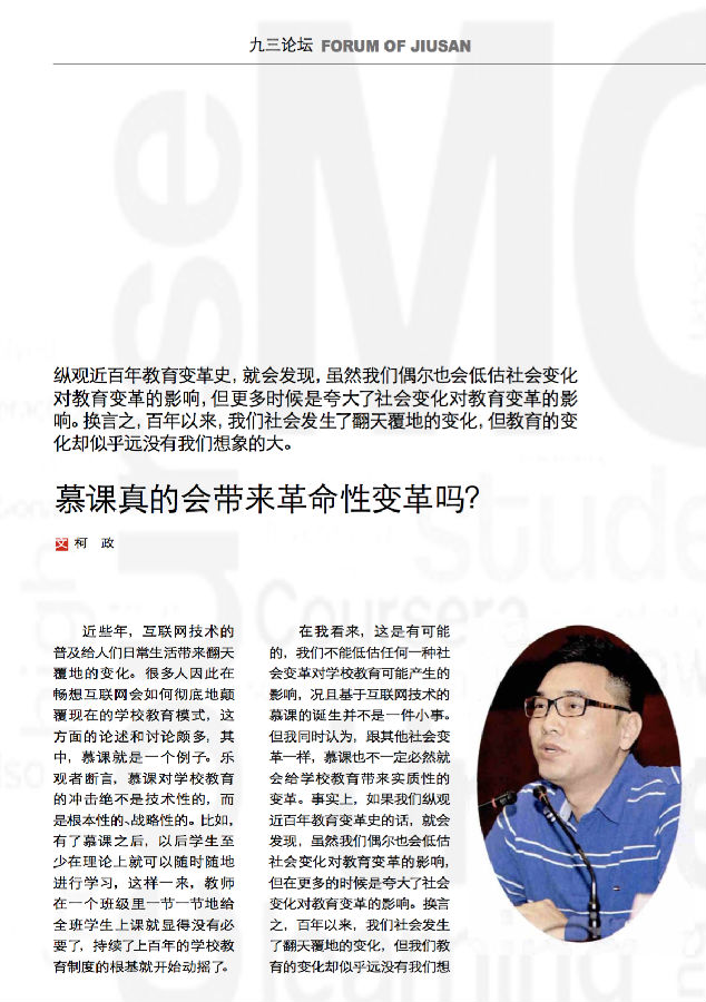 近日,九三学社中央委员会主办的刊物《民主与科学》对部分报告内容进行整理,并补充了个别知名专家的意见,做了一个专题,柯政博士发言的部分内容——《慕课真的会带来革命性变革吗?》也位列其中。柯政博士首先把慕课对学校教育的可能影响放置在漫长的教育改革历史的坐标体系中思考,提出虽然我们有可能犯了低估慕课对教育影响力的错误,但我们有更大的可能是高估了慕课对学校教育的影响。在这个认识基础上,柯政博士继而从课程的角度对慕课的真正价值进行分析,并提出如何利用慕课来扩大优质教育资源覆盖面的建议。