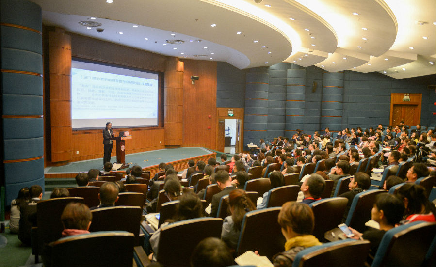华东师范大学中文系教授、国家基础教育课程改革语文课标组组长巢宗祺教授在题为“核心素养与语文课程建设”的报告中,从语文课程与语文素养、语文学科核心素养、语文课程建设的回顾与展望三方面,畅谈对语文学科核心素养的见解。他指出,“未来基础教育的顶层理念就是强化学生的核心素养”,并将语文学科的核心素养概括为语言建构与运用、思维发展与提升、审美鉴赏与创造,以及文化传承与理解。最后,通过回顾语文课程建设从“知识”、“能力”到如今“素养”的过程,巢教授指出,任何一种学习语言文字运用的课程其实都是在做“语言建构+”的工作,今天的语文课程建设需要渗透中华优秀传统文化、革命文化和社会主义先进文化。