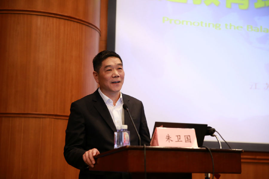 ▲ 江苏省教育厅副厅长朱卫国介绍促进教育均衡发展的江苏路径