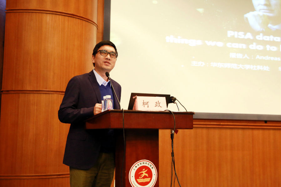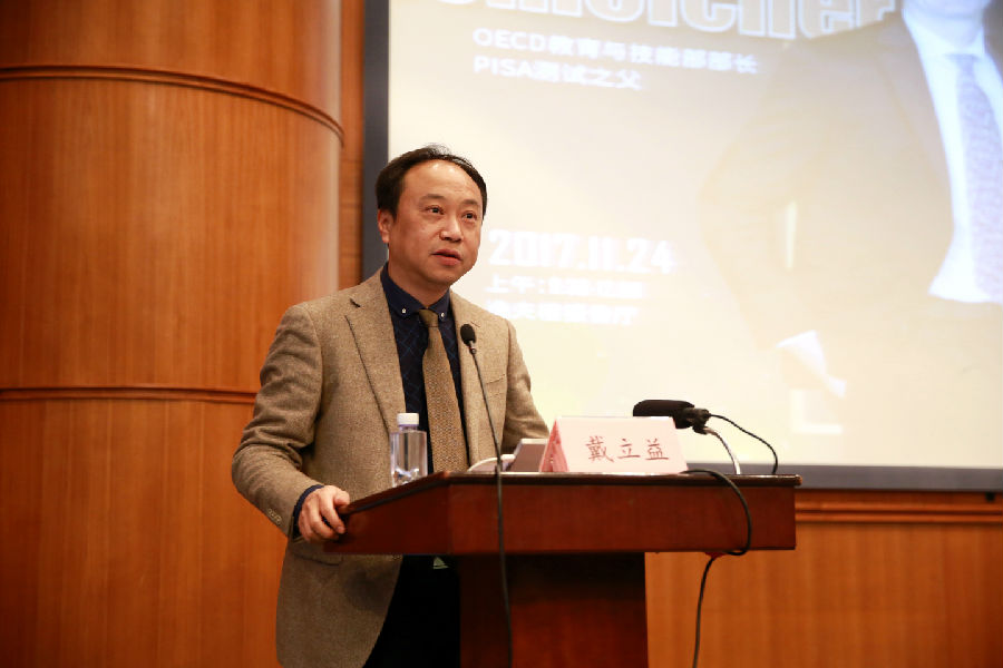 大夏讲坛上半场由课程所副所长杨向东教授主持,华东师范大学副校长戴立益出席并致辞。戴立益表示,自2000年启动以来,PISA得到了全球政界、教育界及公众越来越多的关注,上海学生在PISA测试中连续两次问鼎全球,基础教育的上海发展经验已得到了越来越多的公众了解和国际认可,这次很荣幸能邀请到Andreas Schleicher部长来解读PISA数据,这次活动也将是学校服务基础教育、尤其是上海教育的又一次尝试和突破。