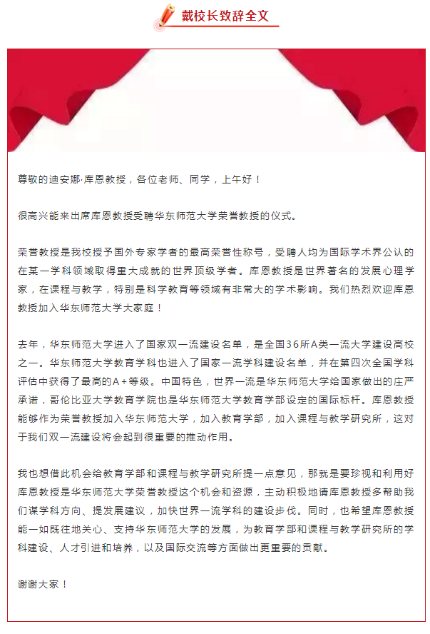 5月10日上午,华东师大副校长戴立益教授代表学校给美国哥伦比亚大学Deanna Kuhn教授颁发了华东师大荣誉教授聘书并致辞。
