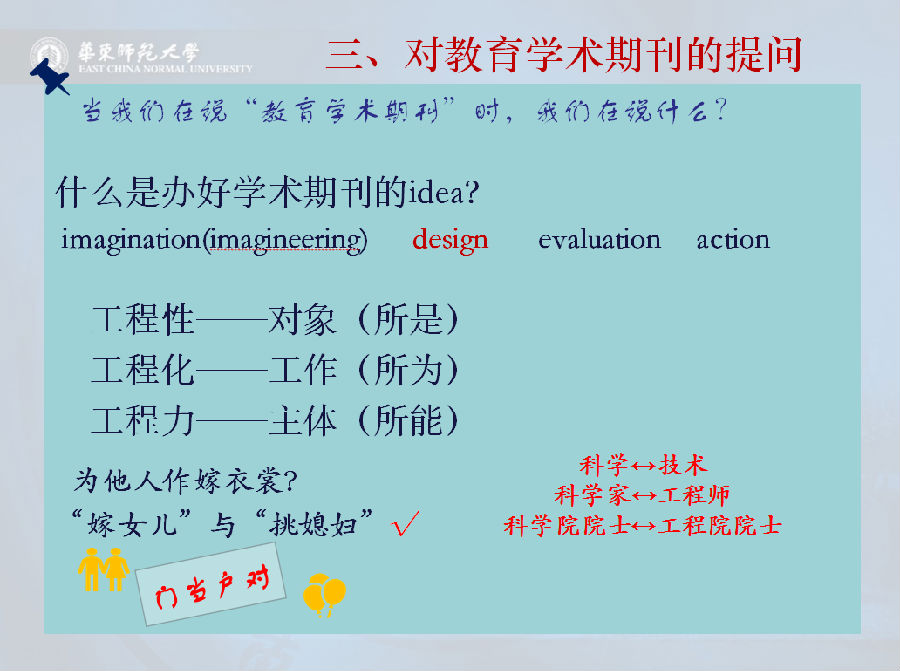 杨主编以《华东师范大学学报(教育科学版)》为例,解析了教育学术期刊对 “教育研究”外延与内涵的不一样的看待,诠释了教育学术期刊的目标定位和功能定位,从栏目构建、组织实施、评估改进、质量甄别等方面论述了教育学术期刊的质量工程。杨主编指出,“工程性”是学术期刊的本质属性,“工程化”是学术期刊的运行机制,“工程力”是学术期刊人的能力要求。