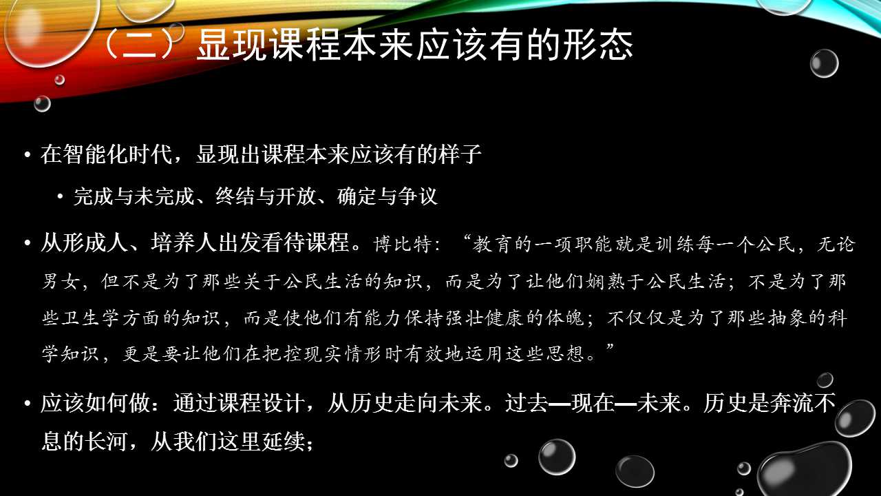 在课程研究之始,博比特的《课程》就是从形成人,培养人的角度来谈课程的形态的。他说:“教育的一项职能就是要去训练每一个公民,无论是男女,不是为了那些关于公民生活的知识,而是为了让他们娴熟于公民生活;不是为了卫生学方面的知识,而是为了使他们有能力保持强壮健康的体魄……”现在的核心素养也是如此,目的不是为了让学生仅仅学书本上的知识,而是为了让他形成那方面的基本素养。从这个角度来思考课程,我们就知道课程应该怎么做,应该如何做,我们应该通过课程设计,让学生从历史走向未来。历史的长河是奔流不息的,我们课程设计要立足现在,把过去的东西拿到现在,拿到现在是为了更好的未来。所以,课程研究的意义是去显现课程应该有的形态。