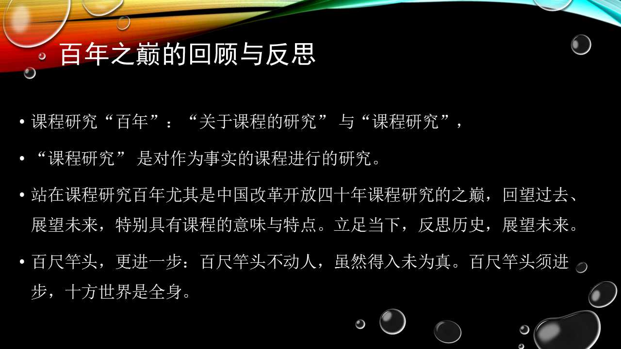 借用中国的一句古话:百尺竿头,更进一步。如果把课程一百年看作是百尺竿头的话,我们现在就要从百尺竿头继续往上走。“百尺竿头不动人,虽然得入未为真。百尺竿头须进步,十方世界是全身”。