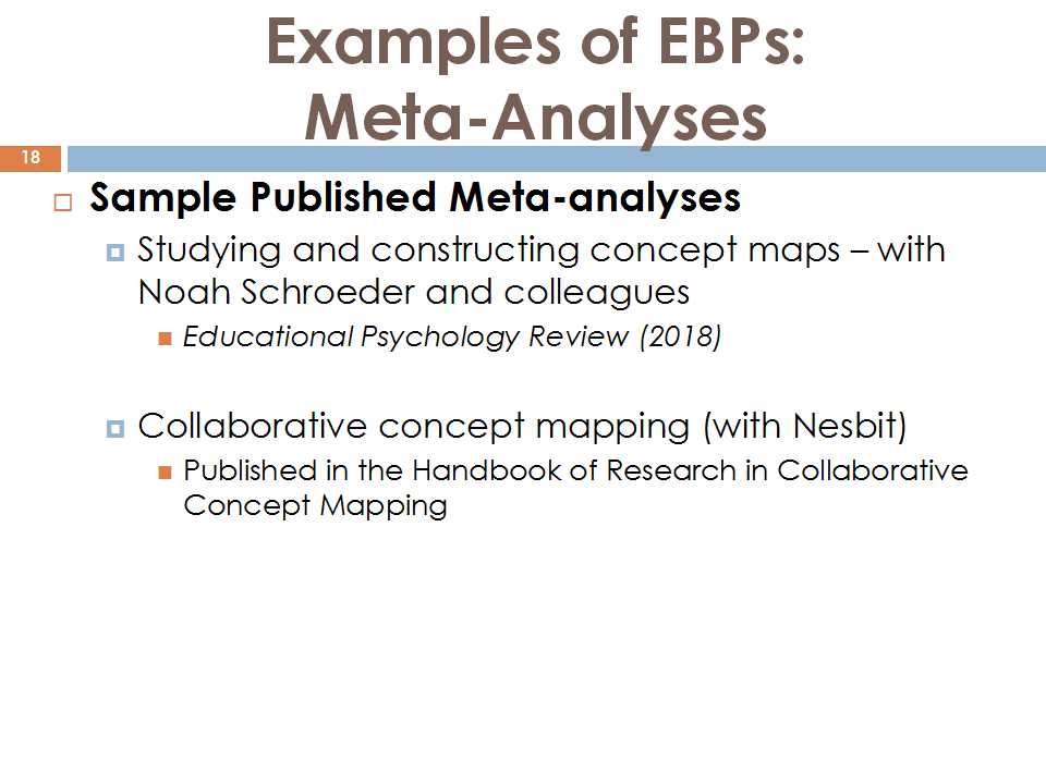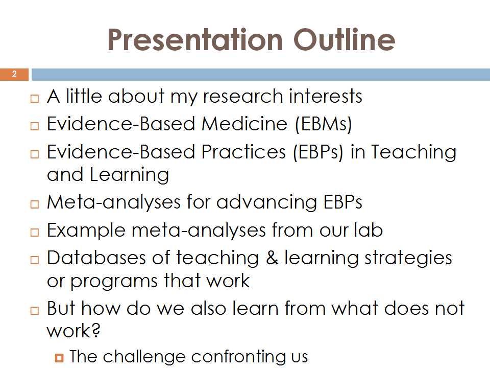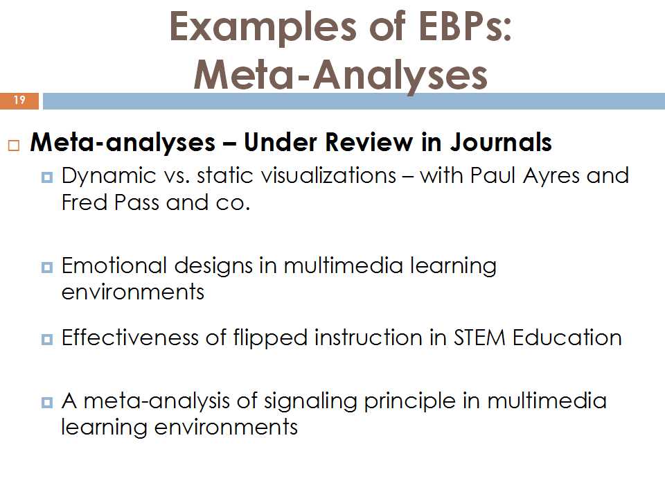 我们可能有不同的研究兴趣点,比如教育心理学专业背景的人看到有这个PPT里的背景,就会想到概念构图还有学习分析等等。尽管我们有很多的研究兴趣,但是这次在我的报告当中主要关注的,还是基于证据的教学与学习。我们可以看到其他学科里面讲的类似的定义,例如EBM,就是基于证据的医学。EBM主要的目的是让大家了解自己所学的学科是基于可靠的证据的,而且要证明这种证据是否具有可靠性和合理性。使用这种策略需要一种非常好的对各种相关问题的分析。从医学方面举个例子,证明我们必须要有非常好的循证实践:例如看病吃药不仅要对某种医药方法的评估,还要知道如果使用了某种治头痛的药,会不会对其他方面产生影响。也就是说不光是治头痛,还要考虑头痛治了以后会不会有其他的副作用。我们要看不同的条件下和背景下这种治疗方法是否仍旧是有效的。