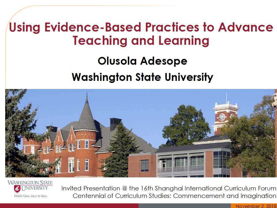 大家早上好!非常感谢崔允漷教授邀请我来到这里作报告,也非常荣幸第一次来到上海,希望能够在这个周末一直持续享受这次会议的精彩报告。我来自华盛顿州立大学,今天,我要讲基于证据的实践对教学和学习的影响,这里我将讲一些基于证据的教学和学习方面的研究,主要是要对整合分析方面的体会。这个研究是华盛顿州立大学所进行的,另外还有两个数据库专门研究教育学策略。我希望通过这次报告,一方面是想告诉大家我们现在在美国做的还算不错,希望可以和大家交流;另一方面主要还是希望可以抛砖引玉,让大家去考虑一下新的知识形式。当然,后面一个方面是我此次报告想达到的目的。
