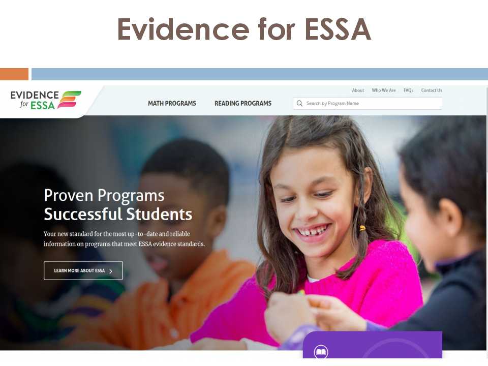 ESSA项目,是要给每一个学生的成功提供证据的一个项目。这是他们的网站,里面有关于文学素养或者是数学、科学、人格、行为等有各种不同的项目。我们做了相关的网站来帮助那些在这方面学的还不是很好的学生。