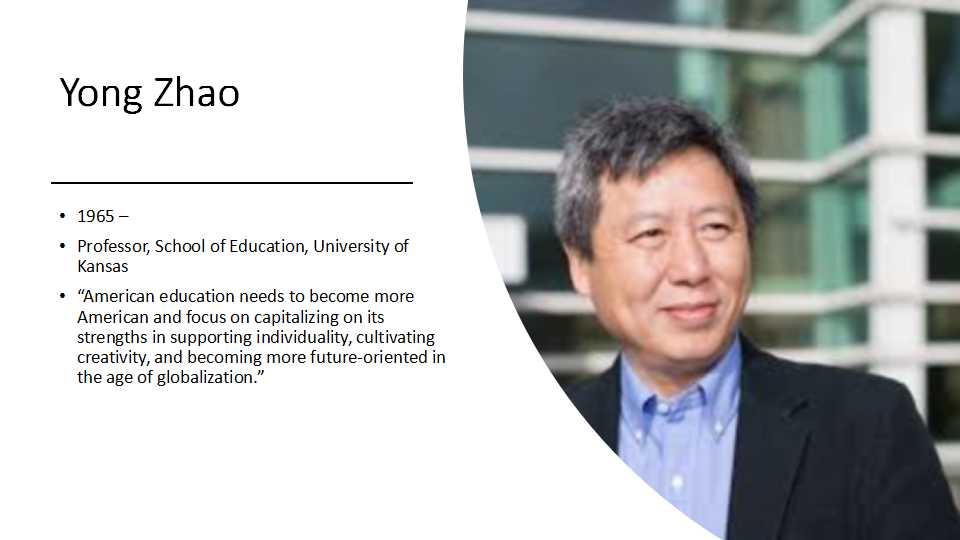 大家下午好!非常感谢华东师范大学课程所能够组织这一次会议,感谢大会的邀请。我的上级主管也非常支持我参加此次会议,今天早上我们已经听过许多有关博比特的理论,那我们来看看他长什么样子。我快速引用他一句话:学校应该记住,既然学校教育的目的是为了培养适应社会环境的人才,如果环境在不断改变,那么学校也必须做出相应的改变。另外一个也是教育学家杜威,他说教育的持续原则,必须在教育的每一个阶段都要考虑到未来。下一位是在华师大和美国社会都非常知名的赵勇教授,他认为美国的教育需要变得更加美国化,应该将美国的教育优势用来支持私人的个体发展,培养创造力,同时为大家进入全球化时代做好准备。