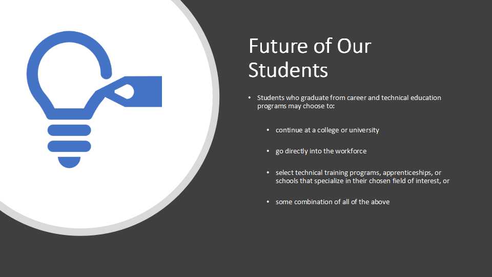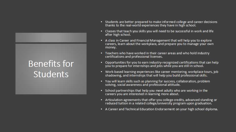 比如说第一点,最好在高中的时候能够以与实际接轨的方式,马上从事些相关的工作,能够为高中之后的生活做好充分的准备。我们的C.T.E课程不仅仅让学生能够学到知识,还要培训学生,让他们能够有多样的选择,既可以选择继续上大学,也可以直接进入工作中,也可以选择一些技术培训方面的培训项目,上面三点他们可以同时结合起来做。