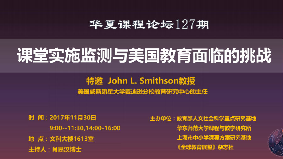 In the afternoon, Professor Smithson gave a report entitled "Education in a post-modern society: What will education in the U.S. look like in twenty years". In this report, based on the SEC project data and Prof. Smithson’s extensive experience, he pondered and looked forward to the future direction of American education. He pointed out that cultural diversity and technological developments have posed tremendous challenges to school curriculum and education, and one efficient way to conquer these challenges is “story-based curriculum”, which means melting knowledges, social situation and personal experience into stories, so that students can learn by understanding, promoting and telling these stories.