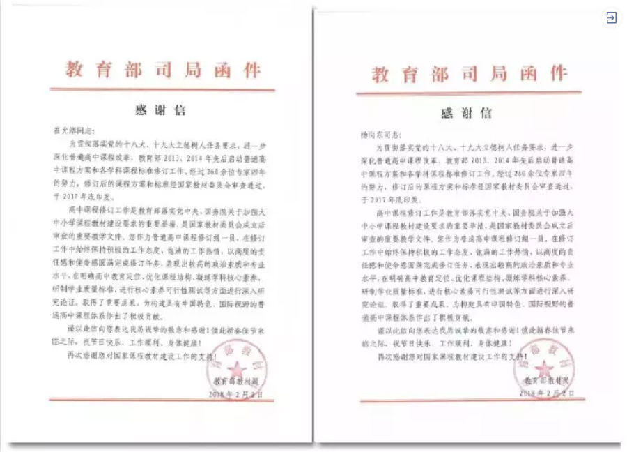 Prof. Cui Yunhuo, Ren Youqun, Yang Xiangdong, Wang Zuhao and other professors participated in the revision of the new round of general high school curriculum and curriculum standards of the Ministry of Education, received a “thank you letter” from the Textbook Bureau of the Ministry of Education.