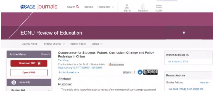 Recently, Associate Professor Wang Tao published an article entitled “Competence for Students' Future: Curriculum Change and Policy Redesign in China” in the English publication ECNU Review of Education.