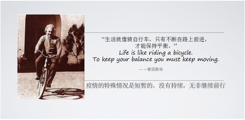 Einstein once said that “Life is like riding a bicycle, to keep your balance you must keep moving.” The education online and offline is like riding a bike, only if we keep moving, can we keep the balance. After all, the epidemic is short-lived, it gives us a chance to try, but if you don’t ride the bicycle continuously, you wouldn’t enjoy the gusts of breeze blowing through our ears.