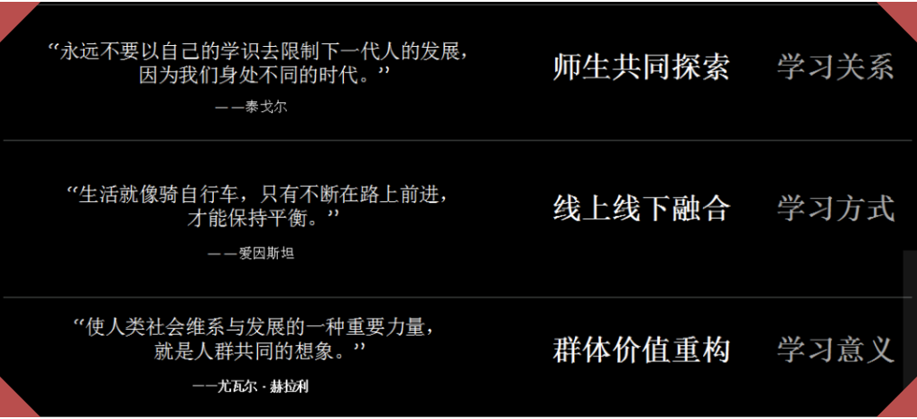 We need a new learning culture for teachers and students to explore knowledge together. The reconstruction of group value enables us to realize the space of online and offline integration. What we have to consider is the nature of curriculum, the relationship of learning, the way of learning and the significance of learning. Thank you!