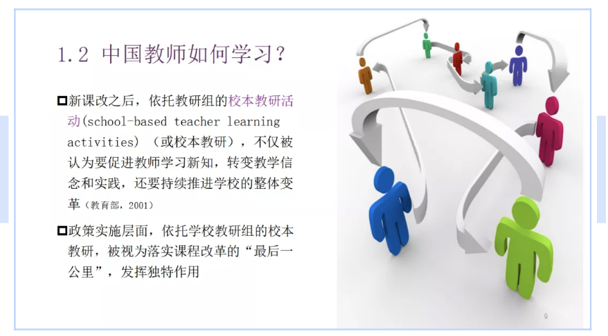 Centering on the problem of “To what extent does school-based teaching and research promote teachers’ continuous learning and teaching reform under the context of the new curriculum reform”. she mainly talked about three aspects: first, how teachers’ learning occurs in school-based teaching and research; second, how knowledge develops during their learning process; third, the factors that affect teachers’ learning and their changes.