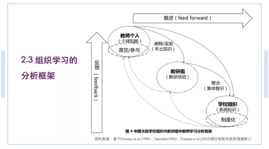 Based on the related research in two middle schools in Shanghai, Zhang constructed an analytical framework from the perspective of organizational learning and knowledge management, in order to analyze the process of teacher learning.