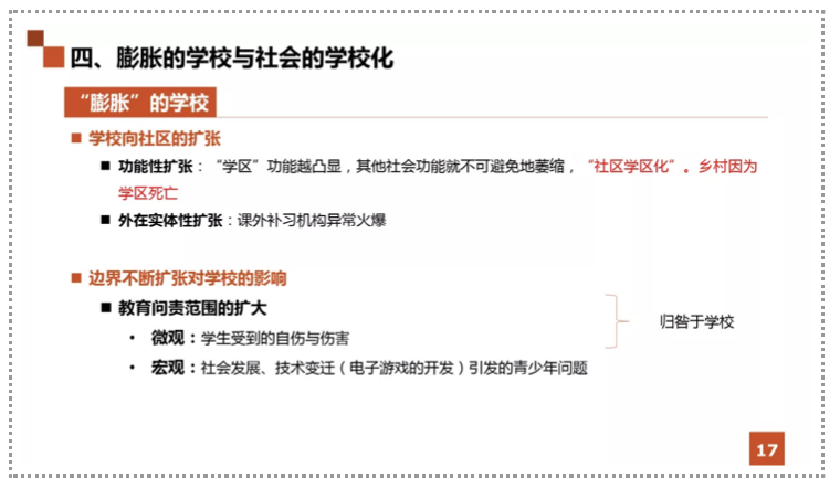 I think an important problem has been overlooked, that is, the ethical relationship between the school, family and society. School, family and society are different ethical entities and cannot be substituted for each other.