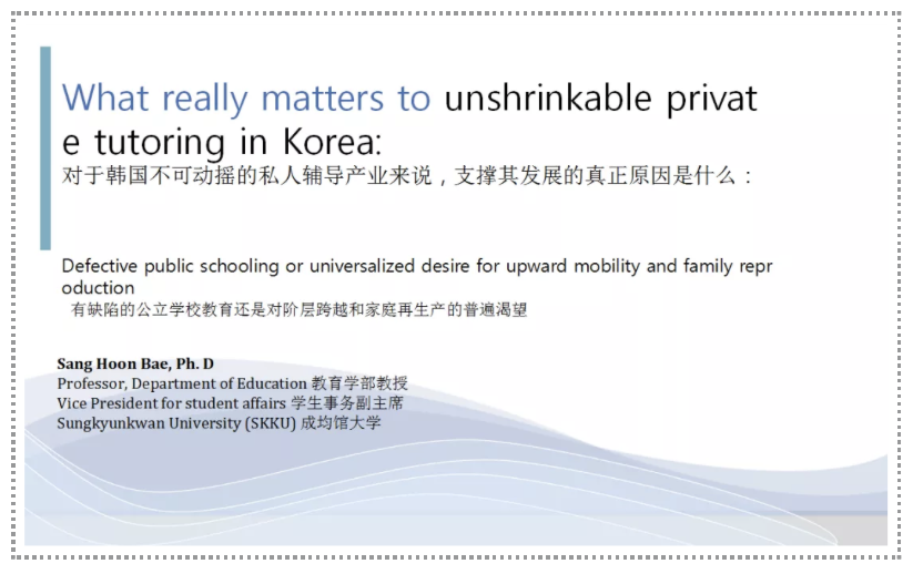 Hello everyone, I’m Bae Sang-Hoon from Sungkyunkwan University, thank you for inviting me to make a speech here. The title of my speech is “What really matters to unshrinkable private tutoring in Korea?”