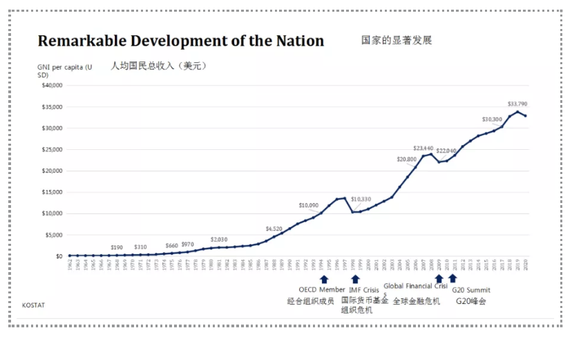 In order to explain the social phenomenon of private tutoring in Korea, we must first look at the economic and social development of Korea and the social and educational problems behind it. The slide you see now shows the economic development of Korea after the Korean War. At the end of the Korean War in 1953, Korea’s per capita income was only 67 US dollars. Today, half a century later, Korea’s per capita income has reached 33790 US dollars, an increase of 500 times.