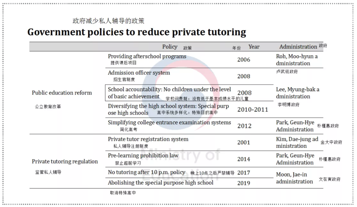 Let’s take a look at this table, which shows what policies the government has implemented to curb the surge in private tutoring.