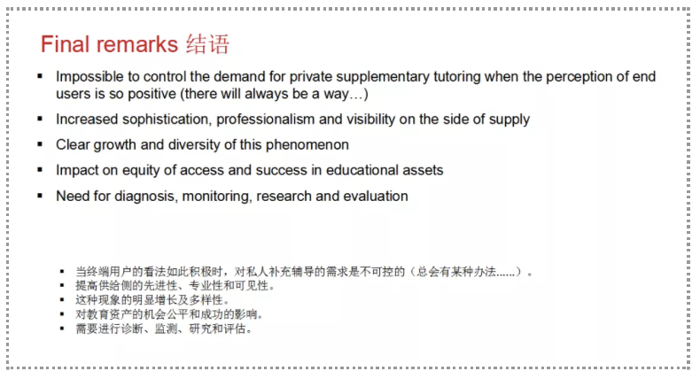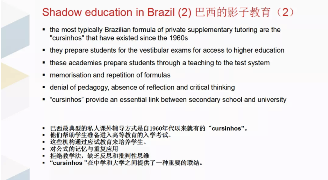 It is necessary for us to diagnose this in order to better understand the reality and monitor the system, which is not entirely up to the government. It is necessary for us to do more research and evaluation. I have participated in some studies and tried to work with colleagues from different countries to make a modest contribution to the research on shadow education in Brazil. Thank you!