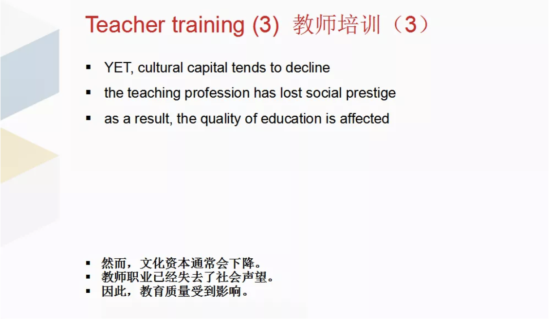 This phenomenon has caused some problems. The teaching profession is mainly composed of people at the bottom of the society. The quality of education will be affected.
