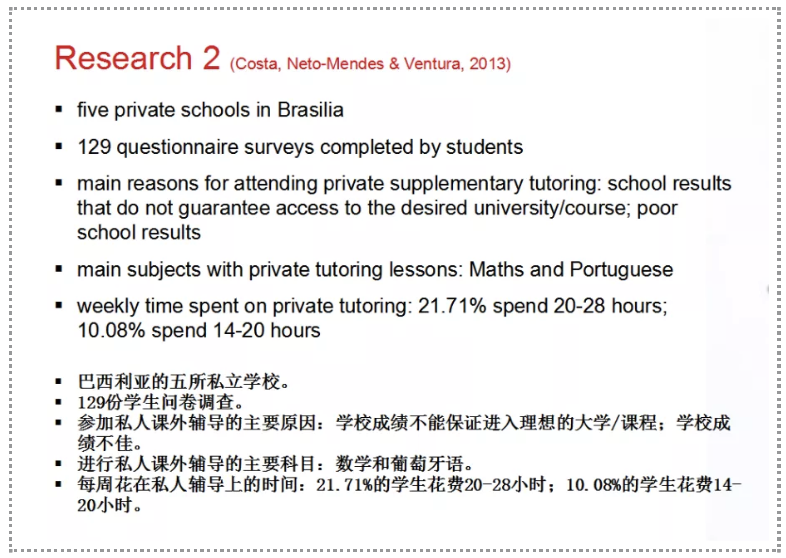 The second study in Brazil mainly investigated the characteristics and highlights of private tutoring courses and the main reasons for students’ participation in tutoring. The study found that students and parents are satisfied with the results of their investment. They continue to participate in tutoring and continue to pay for these courses. They admit that tutoring enables them to succeed in the challenging exams they need to pass. You can see from these data that students think their time, effort and investment in these courses are reasonable.