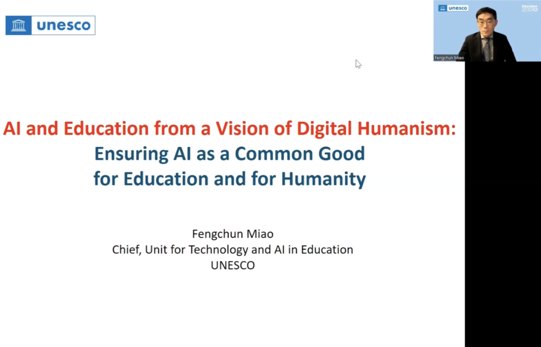 Miao Fengchun, Director of Education Informatization and AI Applied Education Department at UNESCO, made a report entitled "AI Education from a Vision of Digital Humanism", introducing UNESCO's advancement in the field of artificial intelligence and education and the recently released "Artificial Intelligence and Education: A Guide for Education Policy Makers", which emphasizes that the public interest of education and human beings should be fully considered in the process of artificial intelligence trying to change education. In this way, Director Miao Fengchun proposed the development direction of digital humanism, that is, beyond narrow humanism, to reflect on human existence and human value from a broad sense of biocentrism. At the same time, he called on us to re-examine social life and interpersonal relationships in the era of digital technology, build digital technology that serves human value, and promote education to achieve a higher level of digital transformation.