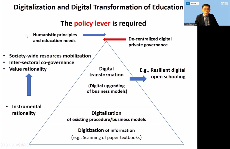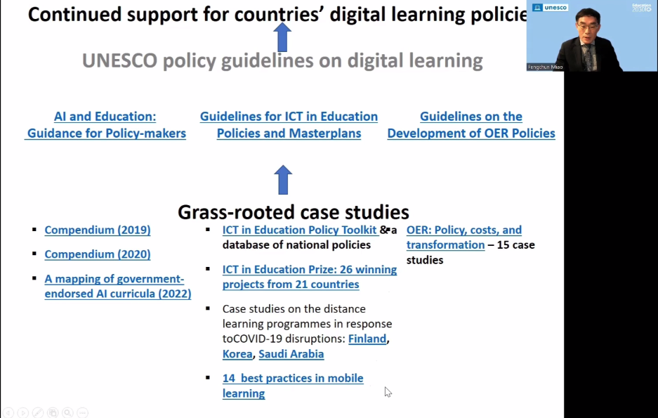 UNESCO has been making a UNESCO closed loop to support countries' educational informatization policies. UNESCO, as an International Center for Standards, has been developing recommendations and instruments in this regard. We are producing guidance compendiums on all important topics in this area.