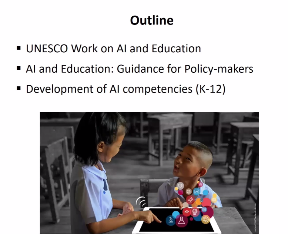 I will share briefly about UNESCO's work on artificial intelligence and education, and I will introduce the recently released report, Artificial Intelligence and Education: A Guide for Education Policymakers. Then, I will also share some reports on the development of artificial intelligence capabilities, especially for school education.