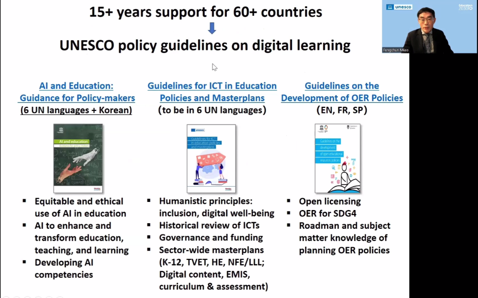 Especially on these three most important themes, we have produced the "Guidelines for ICT in Education Policies and Masterplans" and released it this year which will be in the six UN languages. At the same time, after three or four years of hard work, last year, we released "AI and Education: Guidance for Policy Makers". Currently, it is available in 6 UN languages and Korean.