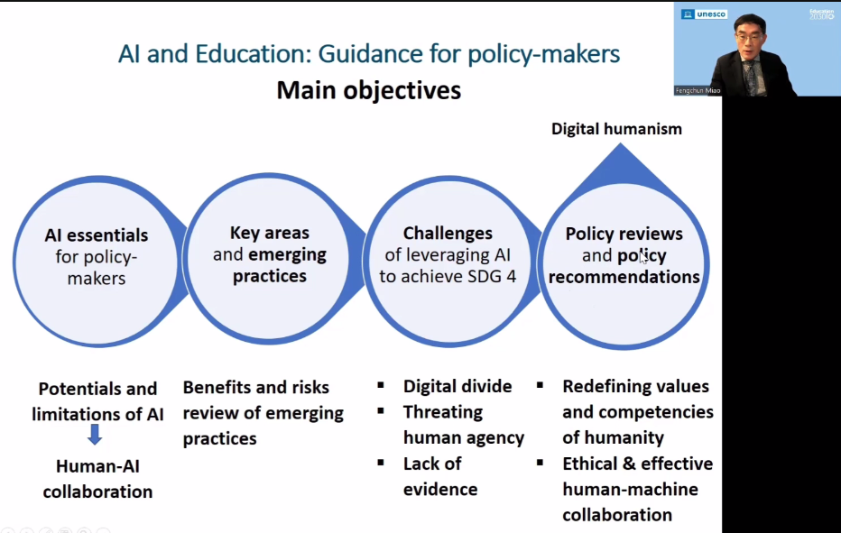 Specifically, in 2021 we published AI and Education: A Guidance for Policymakers. In this guidance, we have attempted to summarize the key must-knows for policymakers about AI, as this is a very new field. Most policy makers, especially in education, lack sufficient understanding of AI and its applications in education, especially how we can use AI to achieve the sustainable development we set in the 2030 Education Agenda Goal 4.