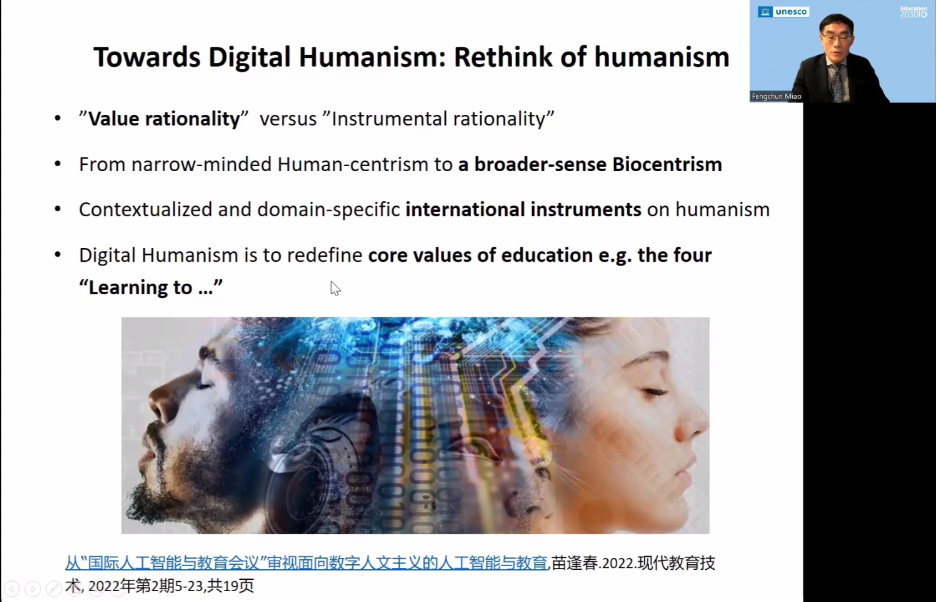 First, there is always a tension between value rationalism and instrumental rationalism, which means that we should consider the value of people first, and then consider people as human resources in the economic sense. For example, other economic organizations, including the OECD, place great emphasis on human resources for economic development. But in the view of UNESCO and the United Nations, we believe that human beings have human value, and when we talk about the application of technology in education, we should emphasize value rationalism.