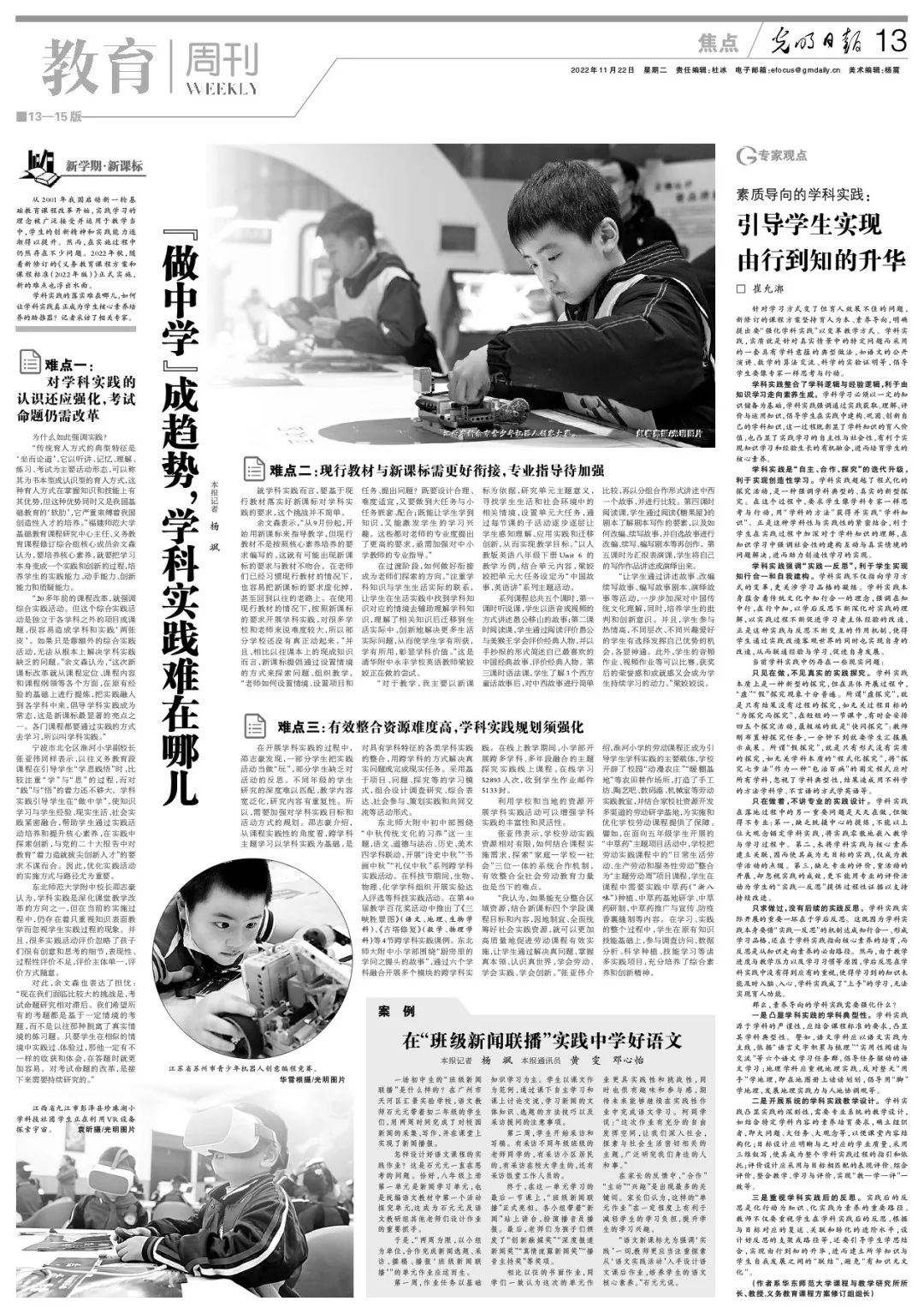 The first is to highlight the disciplinary characteristics. Disciplinary practice stems from the rigor of the discipline, and should be combined with the requirements of the curriculum standards to highlight its features. For example, the subject of Chinese should focus on Chinese practice, and advocate task-driven Chinese learning based on the six language learning task groups like "language accumulation and sorting", "practical reading and communication"; Geology should emphasize the geological practices while against learning geography "by hand", that is, reads or draws on the atlas. It should be advocated that learning geography with "feet", and develops geographical practice and the concept of human-earth coordination.