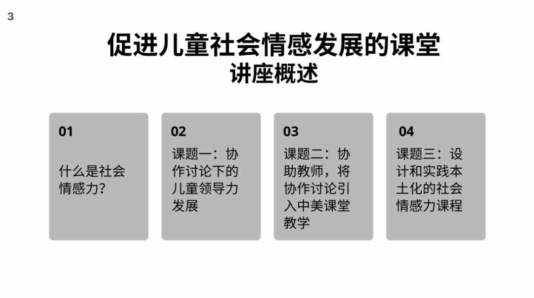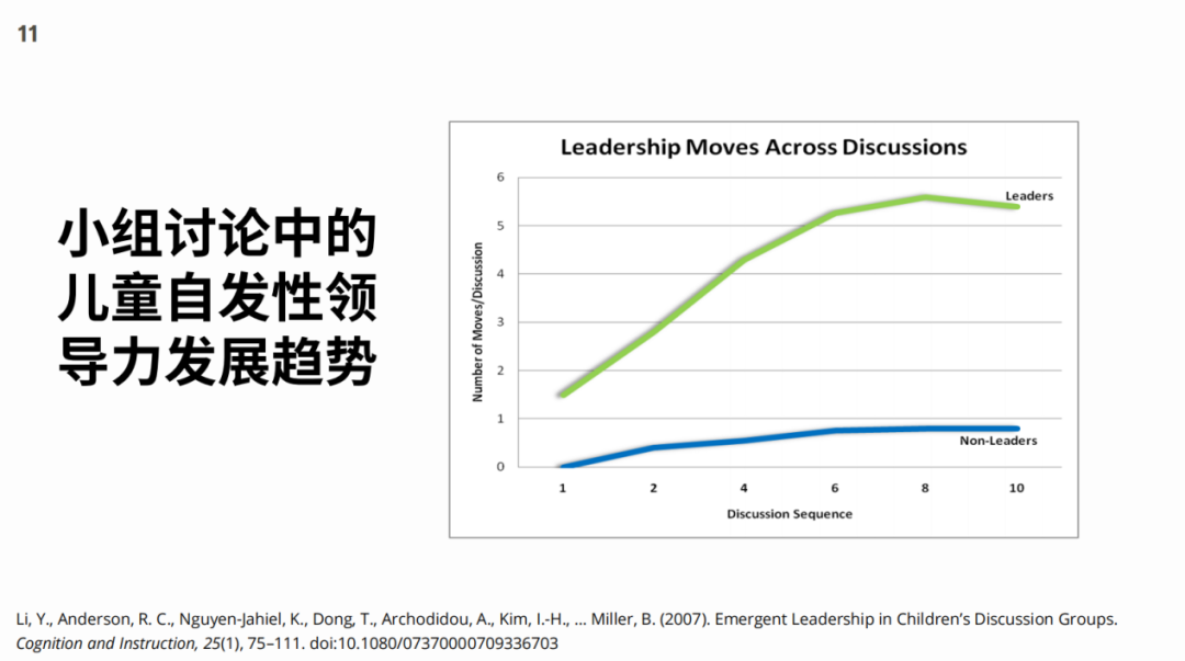 How can social emotional development be introduced into the classroom? Associate Professor Sun Jingjing introduced her two research subjects. Topic 1: Children's leadership development under collaborative discussion. She introduced the collaborative discussion (Collaborative Reasoning, CR) and the concept of children's spontaneous leadership in collaborative discussions that she focused on, and shared the development trend of children's spontaneous leadership in group discussions.